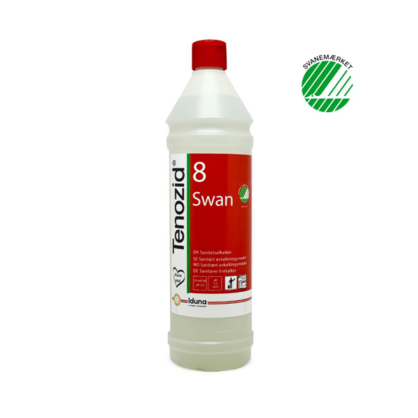 Tenozid 8 Swan paredzēts ikdienas tīrīšanai mitrās telpās. Noņem kaļķakmens nogulsnes, ziepju nosēdumus un ādas tauku paliekas. Lietošanai dušas telpās, ūdens padeves vietās, vannas istabās, tualetēs u.c. Piemērots flīzētām virsmām, jaucējkrāniem, tualetes podiem, nerūsējošā tērauda un alumīnija virsmām, pisuāriem, dušas kabīnēm, krāsotām virsmām u.c.