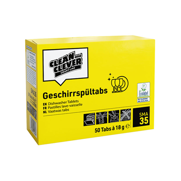 CLEAN and CLEVER SMART Geschirrspültabs SMA35 ir fosfātus un hloru nesaturošas trauku mazgāšanas tabletes, kas piemērotas gan mājsaimniecības trauku mazgājamās mašīnās, gan viesnīcās, gastronomijā utt. lietotajās.