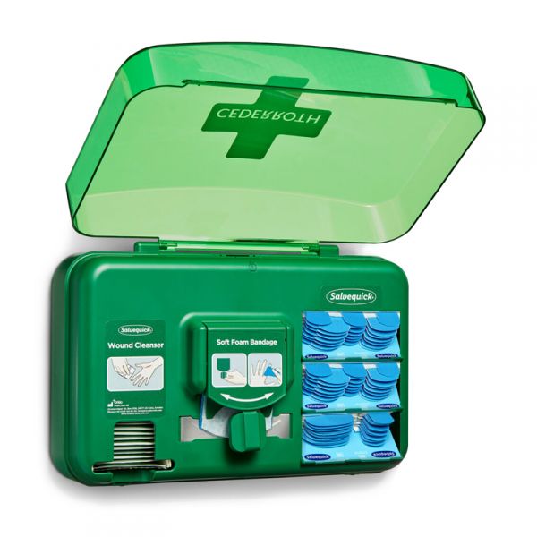 Satur Soft Foam Bandage Blue, pašlīmējošus plāksterus, kas turas pat ūdenī. Dozatorā ir arī brūču salvetes un lielāks skaits dažādu izmēru plāksteru. Brūču aprūpes dozators ir gudrs pirmās palīdzības stacijas papildinājums, un to var novietot netālu no vietas, kur pastāv risks gūt ievainojumus. Putekļu aizsargvāciņš uztur saturu tīru, un dozators tiek uzpildīts, izmantojot komplektācijā iekļauto uzpildes atslēgu.