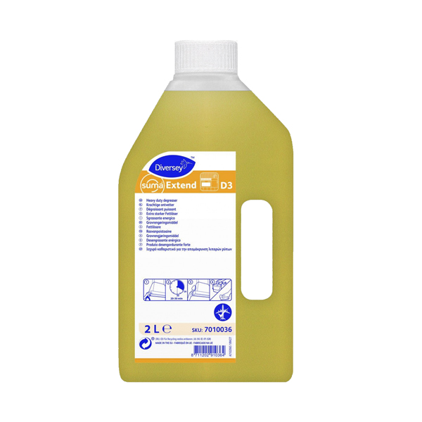 Suma Extend D3 ir sārmains, šķidrs tīrīšanas līdzeklis manuālai grūti tīrāmu virtuves virsmu tīrīšanai, piemēram, tvaika nosūcēju un plīts virsmu. Līdzeklis ir optimāls nejonu virsmaktīvo vielu, sārmu, sekvestrantu un šķīdinātāju savienojums, kas lieliski šķīdina taukus un piekaltuša ēdiena paliekas. Līdzekļa sastāvs formulēts tā, lai tas būtu drošs lietošanai uz alumīnija virsmām.